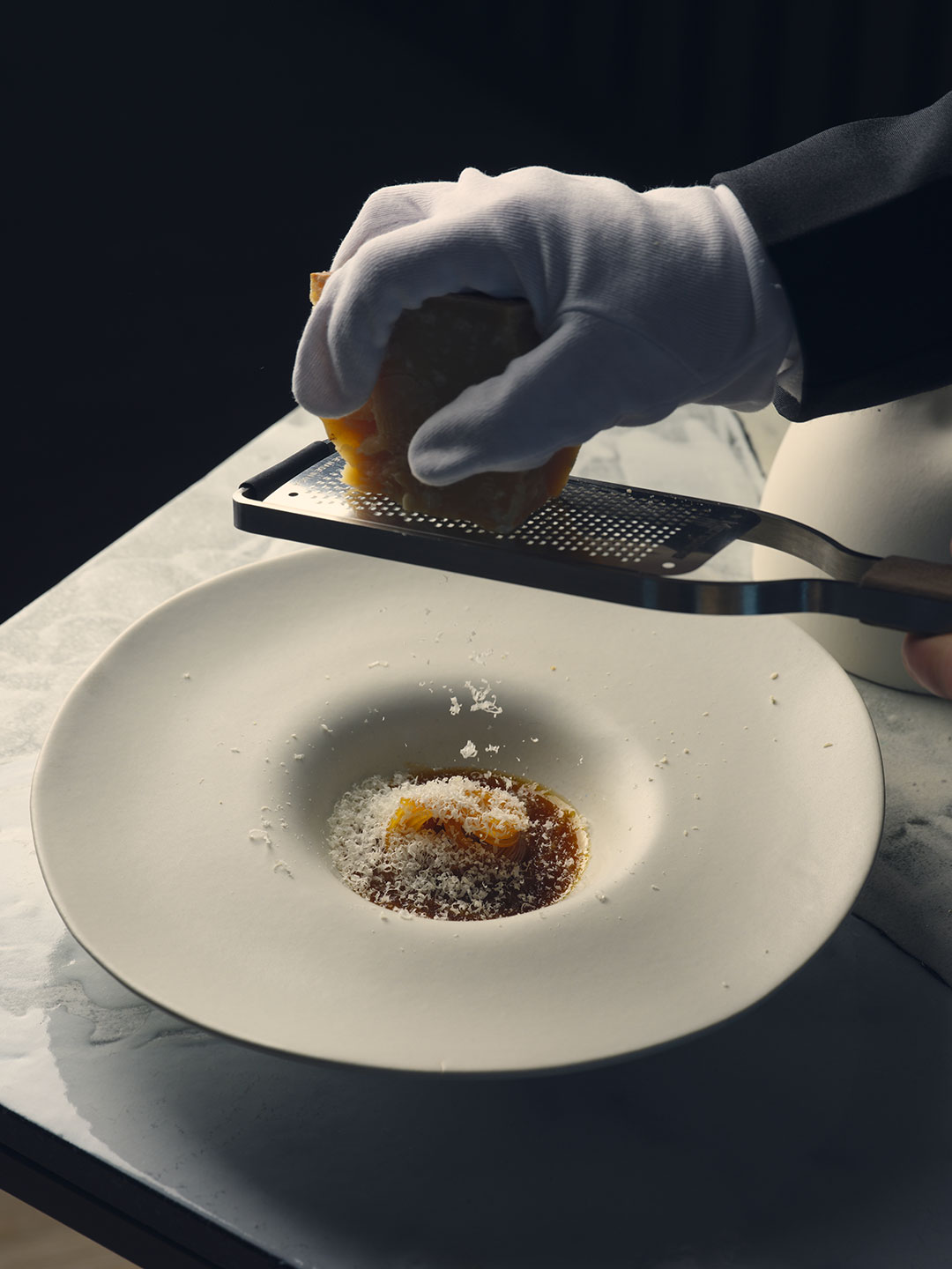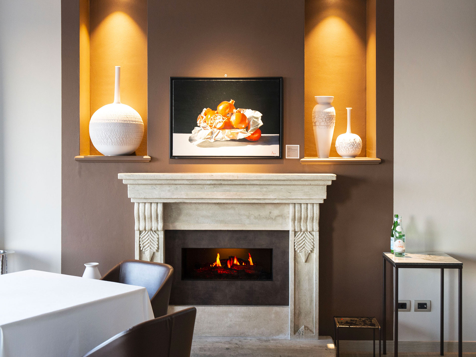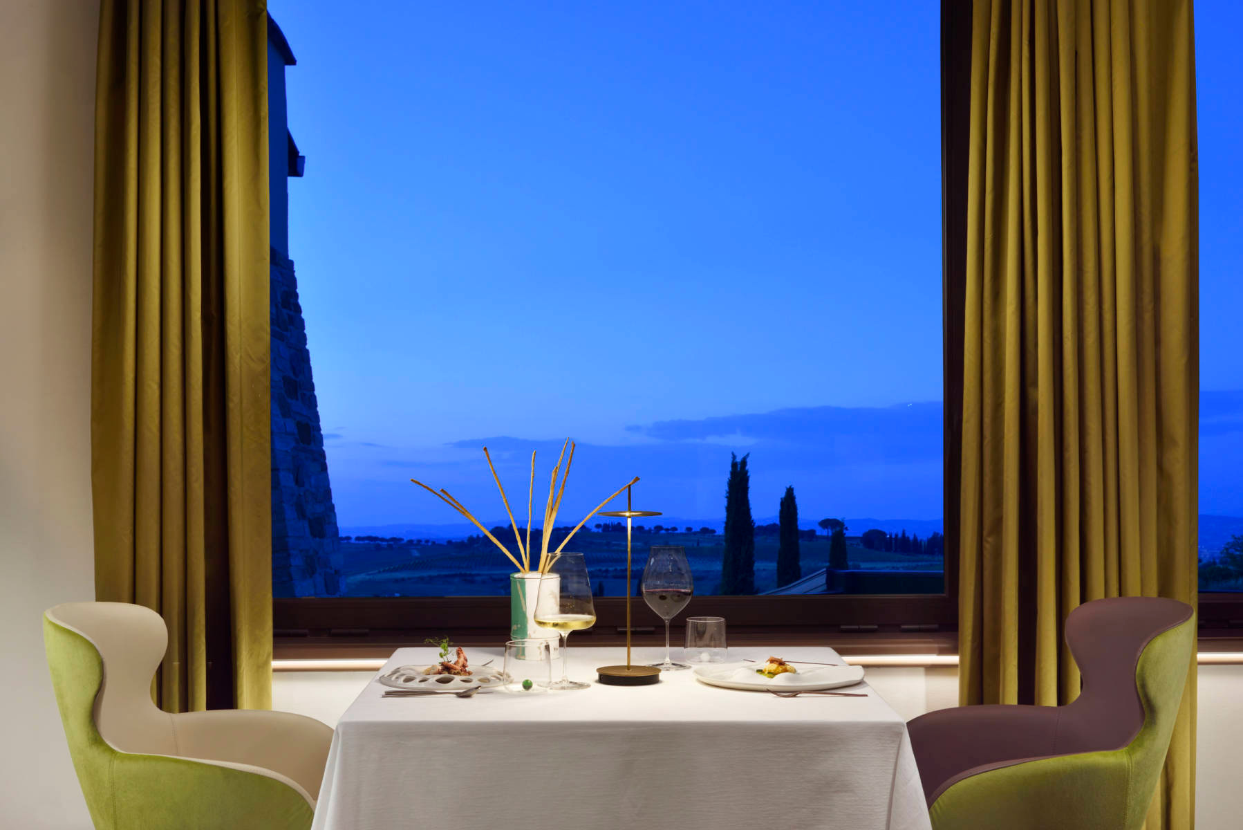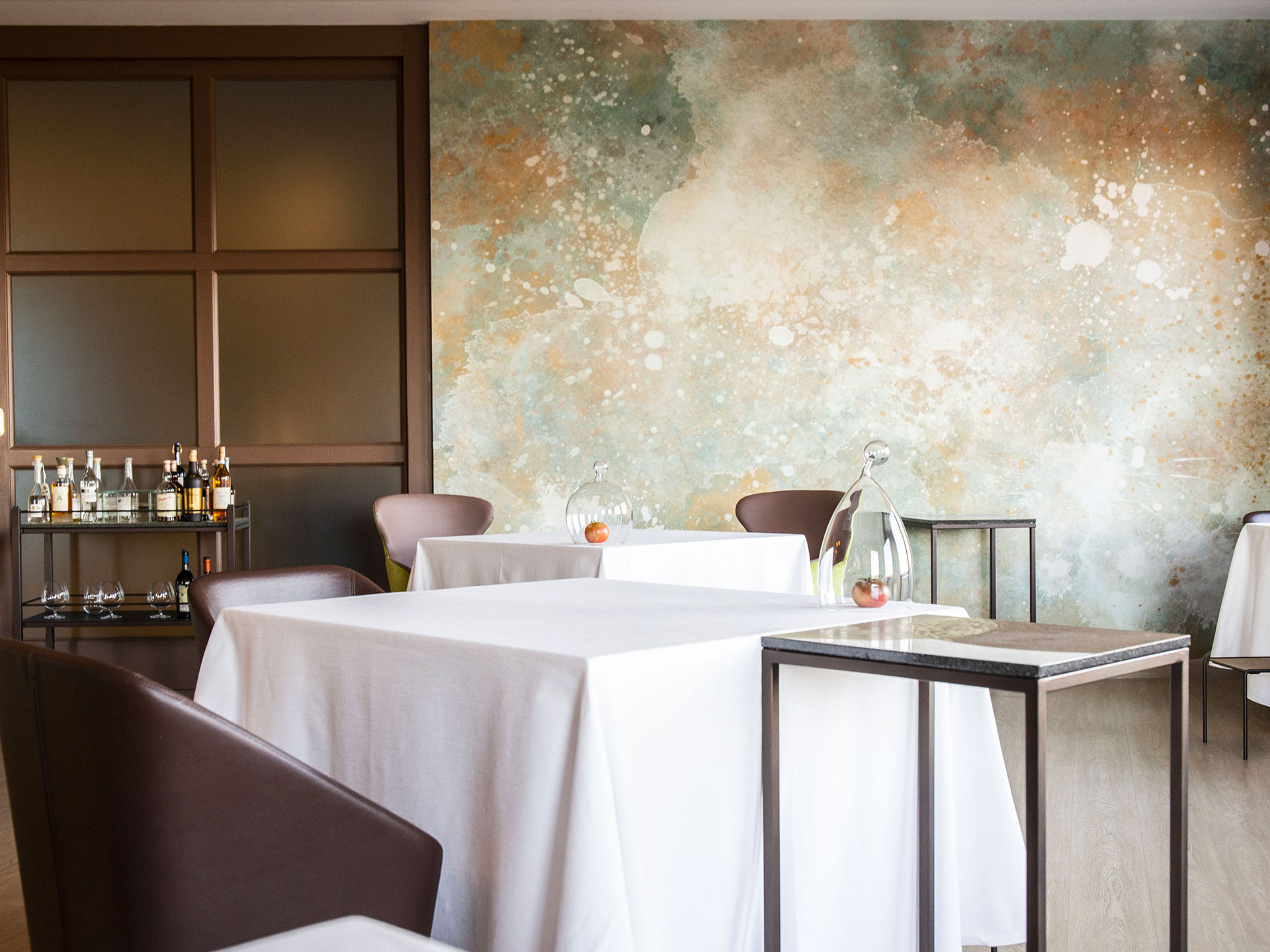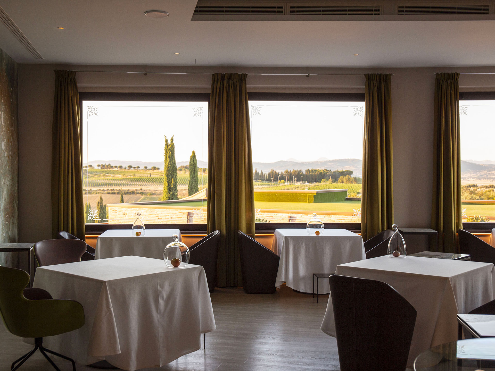 Ambiente intimo, raccolto, elegante: tavoli ben distanziati, la grande vetrata che domina la campagna umbra. Si respira quiete e armonia grazie alla raffinata la mise en place, minimalista e poetica, con la classe di Domiziani che scandisce e dipinge d’arte i momenti trascorsi qui al ristorante Elementi.